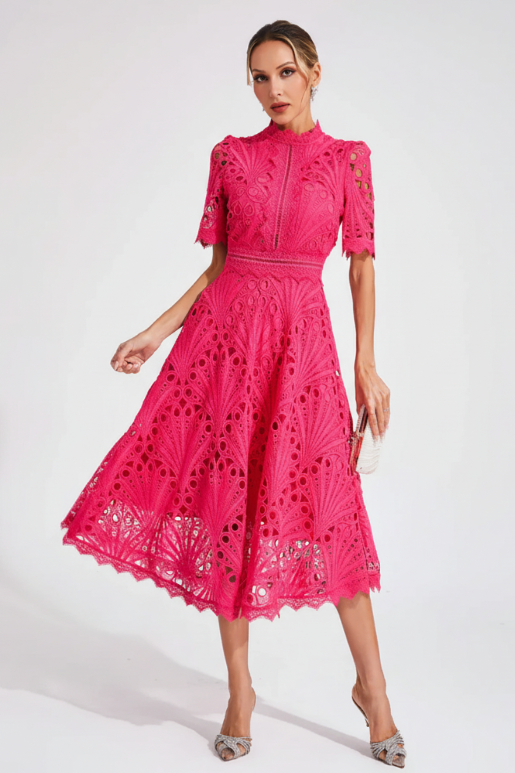 This women’s elegant lace bodycon midi dress features a refined high neck and detailed lace pattern for a sophisticated, feminine look. The fitted silhouette enhances your shape, while the short sleeves and midi length create a balanced and stylish design perfect for parties, weddings, and evening events.